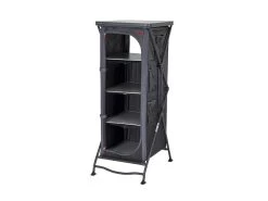 Een compact kookeiland met een unieke constructie. Door zijn unieke constructie is deze kast zeer snel en eenvoudig in- en uit te vouwen. Voorzien van een extra stevige 600 denier polyester hoes met daarin 4 handige legplanken. Het oplegblad van dit kookeiland is hittebestendig, watervast en voorzien van een windscherm (lxb: 61,5×44 cm). Geschikt voor een 4-pits gaskomfoor. De verstelbare poten zijn afzonderlijk af te stellen zodat de legkast op iedere ondergrond stabiel staat. Wordt geleverd in een draagtas. Ingeklapt (lxbxh): 52,5x103x14,5 centimeter.