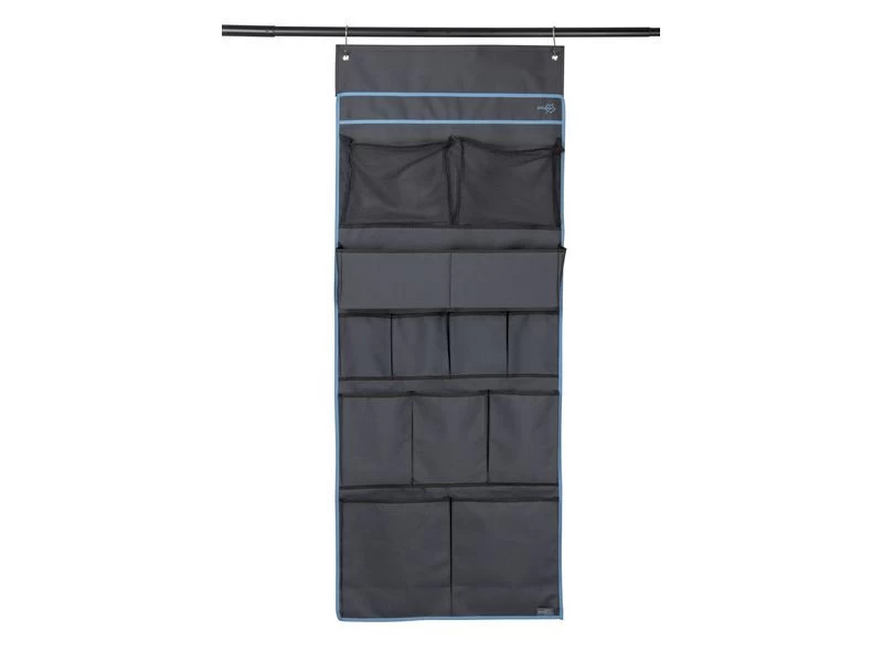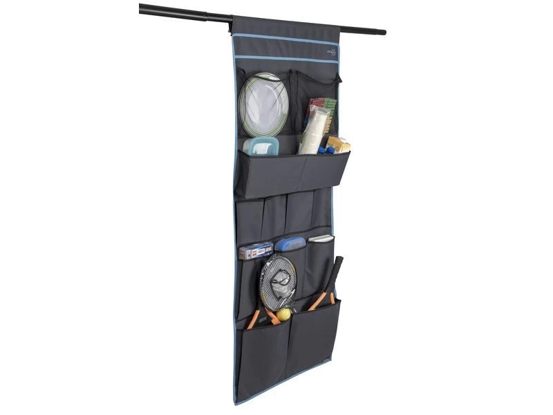 Een multifunctionele zeer ruime 13-vaks organizer. Voorzien van 5 rijen met 2 tot 4 vakken per rij. De bovenste rij is voorzien van mesh met 2 ruime vakken. Zo kan dit tentschort met de pees worden opgehangen aan een caravanrails, met het klittenband aan een tentstok of met de zeilogen aan haken. De lussen onderaan zorgen voor extra fixatie. Gemaakt van 420D nylon.