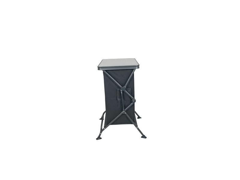 Een zeer stevige kookkast met 2 legplanken. Zeer eenvoudig op te zetten door een uniek uitklap systeem van het blad. Deze kookkast is zeer plat opvouwbaar en gemakkelijk op te bergen. De kookkast beschikt over een hittebestendig en watervast melamine oplegblad en een zwart aluminium frame. De verstelbare poten met stabilisatoren zorgen ervoor dat de kookkast op iedere ondergrond stabiel staat.