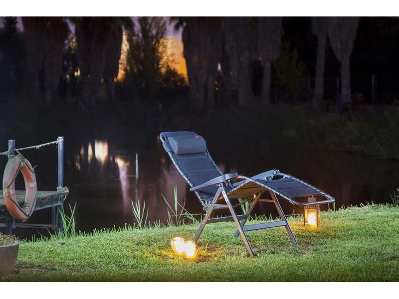 Een zeer luxe relaxstoel met hoofdkussen. De meest comfortabele relaxstoel in de markt. Deze stoel biedt maximaal comfort doordat de stoel traploos verstelbaar is, beschikt over een hoofdkussen en volledig is voorzien van gepolsterde stof bevestigd door middel van elastiek. De comfortabele vulling van deze stof heeft een open celstructuur zodat deze geen vocht vast houdt. Hierdoor is deze stoel sneller droog dan andere stoelen met een traditionele schuimvulling. Daarnaast zijn zowel de rugleuning als de armleggers zijn ergonomisch gevormd en is de stoel voorzien van een remsysteem om de stoel in iedere gewenste positie te fixeren. De stoel is voorzien van een geanodiseerd H-frame voor extra stabiliteit en stevigheid. De stoel heeft een extra brede (54 cm), een extra diepe (55 cm) en een extra hoge zit (50 cm). Ingeklapt is deze stoel zeer compact en daardoor gemakkelijk mee te nemen in de meegeleverde opbergtas. (lxbxh: 95x72x12 cm). Maximale belasting: 130 kilogram.