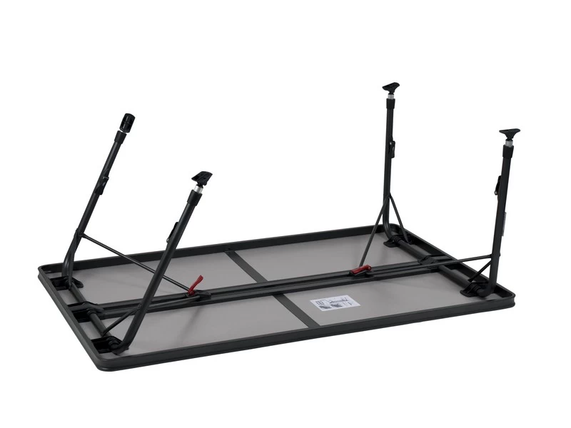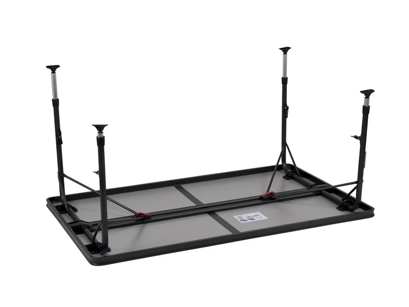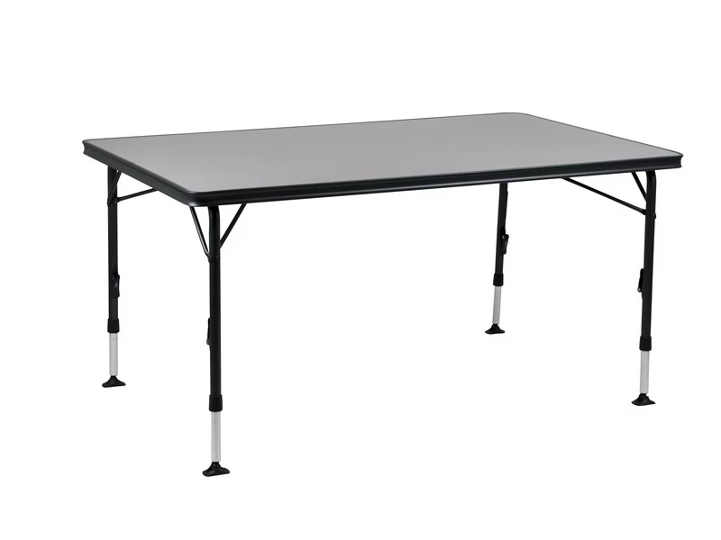 Een zeer stabiele tafel van hoge kwaliteit. Dankzij de speciale constructie is deze tafel eenvoudig in- en uit te klappen. Daarnaast zijn de poten na het inklappen stevig te bevestigen in de geleide aluminium rails aan de onderzijde van het tafelblad. Het tafelblad is extra ruim zodat deze plaats biedt tot 6 personen. De aluminium rails aan de onderzijde van deze campingtafel zorgt eveneens voor extra versteviging. De hoogwaardige materialen en het hittebestendige en watervaste tafelblad zorgen voor een lange levensduur. De poten bieden een hoge stabilteit door de dikke (28 mm) en extra verstevigde buizen. De stabilisatie voetjes zorgen voor extra grip op iedere ondergrond. Deze tafel is licht van gewicht door het aluminium frame.