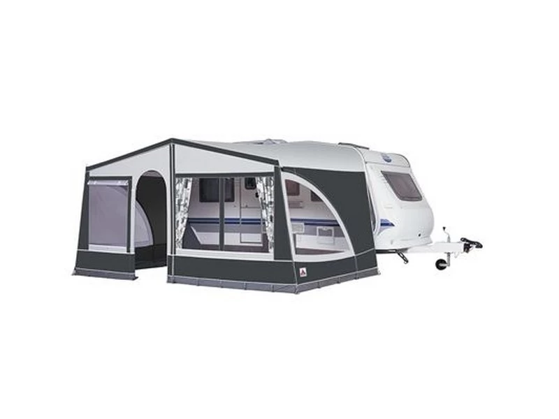 Speciaal voor de Panorama luifel heeft Doréma deze voorwand ontwikkeld die met kunststof haken aan het frame wordt bevestigd. In het midden is de voorwand voorzien van een rits, zodat de mogelijkheid bestaat één helft te verwijderen. Links van de deur bevindt zich een afsluitbaar gaasvenster. Deze voorwand is uitsluitend te gebruiken in combinatie met een luifelframe. Tegen meerprijs is een set gordijnen leverbaar. Bij bestelling altijd het modeljaar van de luifel vermelden.