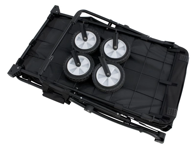 Eurotrail bagagewagen opvouwbaar. Een praktische bagage wagen voor transport van alle campingspullen of handig voor het strand, sport of rondom huis. De caddy is door de comfortabele trek/ duwstang eenvoudig te verplaatsen. Het is in z’n geheel inklapbaar en de wieltjes kunnen er eenvoudig af. Zo wordt de bagagewagen een zeer klein pakketje wat overal gemakkelijk weggestopt kan worden.