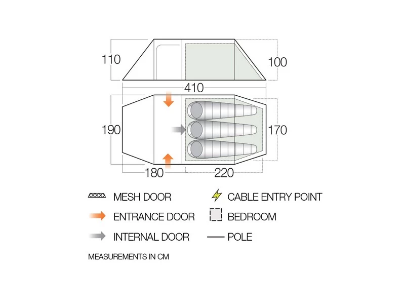 Gepatenteerd Vango TBS® – Tension Band systeem zorgt dat de tent blijft staan bij harde wind. De banden ondersteunen de stokken op 3 plaatsen en voorkomen zijwaartse beweging. Span niet strakker af dan nodig, omdat de stokken anders kromtrekken. Kan bij rustig weer worden opgeborgen.